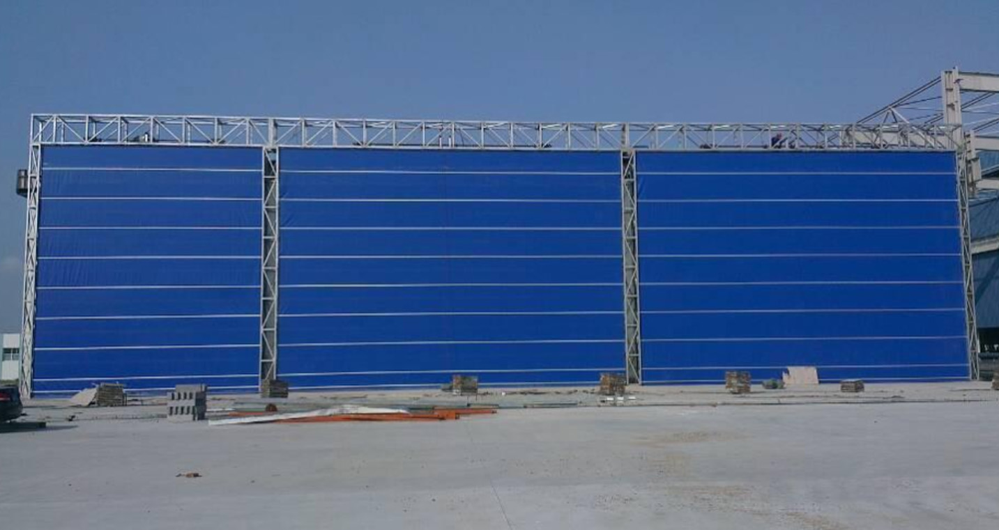 采用本公司这类型大门的传统技术:分片门帘平行横向双层堆积式